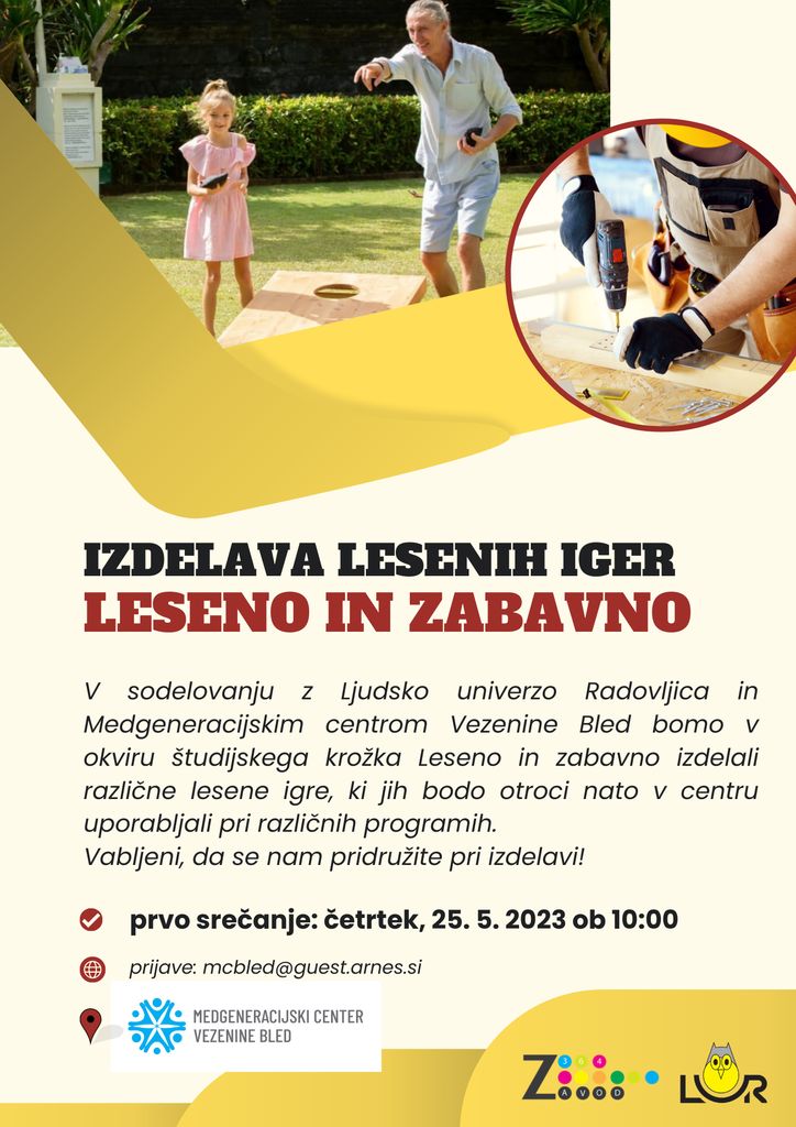 V okviru študijskega krožka bomo pričeli z izdelavo lesenih iger, ki jih bodo nato otroci v različnih programih lahko uporabljali v Medgeneracijskem centru Bled. Uporaba lesa pri izdelavi igrač je bolj trajnostna, saj so igrače bolj vzdržljive in tako rekoč neuničljive, okolju prijazne. Gre za odličen pripomoček za učenje, ki spodbuja motorične spretnosti ter otrokom pomaga pri reševanju problemov. Otrok s tem razvija domišljijo ter krepi socialne veščine. Izdelali bi več lesenih iger različnih velikosti, tudi igre naših babic in dedkov, s čemer bi se vračali k tradiciji. Še nekaj prostih mest za priključitev k študijskemu krožku.