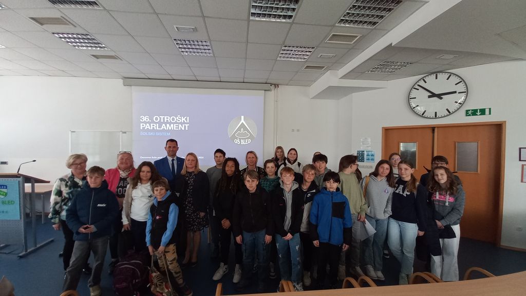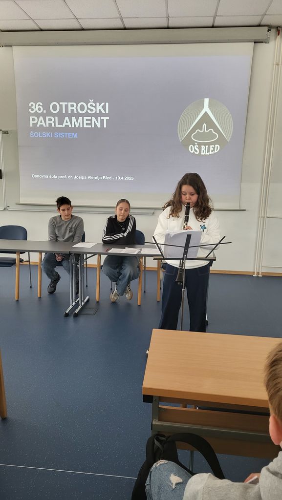 Po dveh glasbenih točkah, ki sta jih izvedla učenca Osnovne šole prof. dr. Josipa Plemlja Bled, na kitari Tim Soklič in na klarinetu Ajda Krčelj, sta predsednik Otroškega parlamenta Viktor Ikač in podpredsednica Ela Rosa Vodnjov predstavila rezultate ankete »Šolski sistem v Sloveniji«, kar je bila  tematika nacionalnega otroškega parlamenta. Anketirali so 195 učencev na blejski osnovni šoli. Rezultati so pokazali, da je šolski sistem potreben prenove in da se z marsičem ne strinjajo tudi na svoji šoli. Npr: večina si želi, da bi se redni pouk začenjal ob 8.20 …