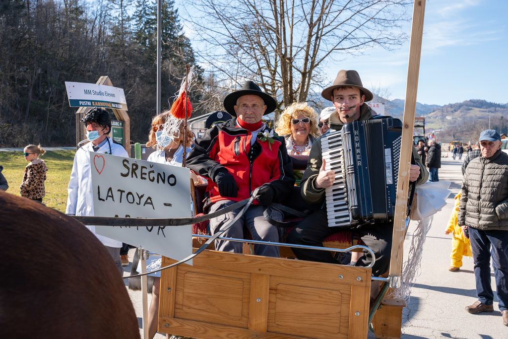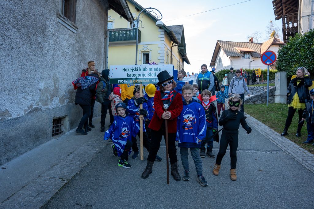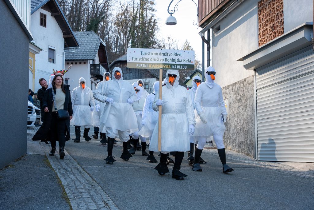 Na letošnji pustni povorki so se tradicionalno predstavile skupinske maske. Med drugimi so se v povorki sprehodili blejski labodi in fijakerji, s(e)rčne in pogumne Blejke, grajski tolkalci, legenda izpod Babjega zoba, Florjan-Svedrar, pa tudi bodoče blejske legende s pogledi kaj prinaša prihodnost v kraju.