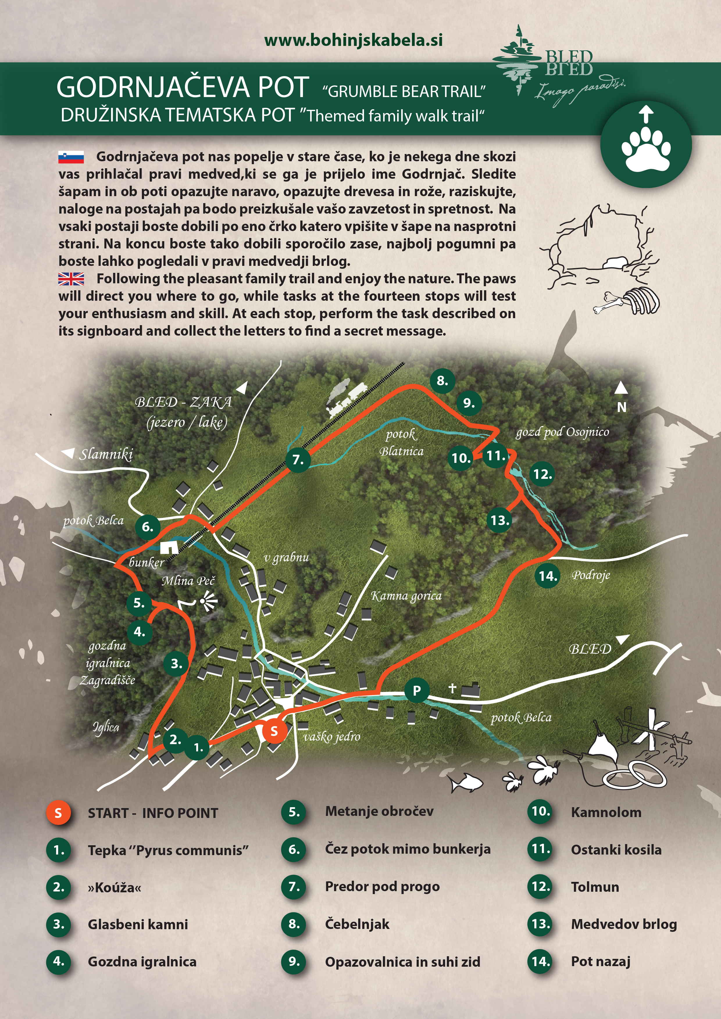 Zgodba o lačnem medvedu iz pripovedovanj o preteklosti vasi je osnova za ime »GODRNJAČEVA POT«. Na poti sledite medvedovim tacam in rešujete naloge na tablah, spoznavate lahko imena dreves in ptic.