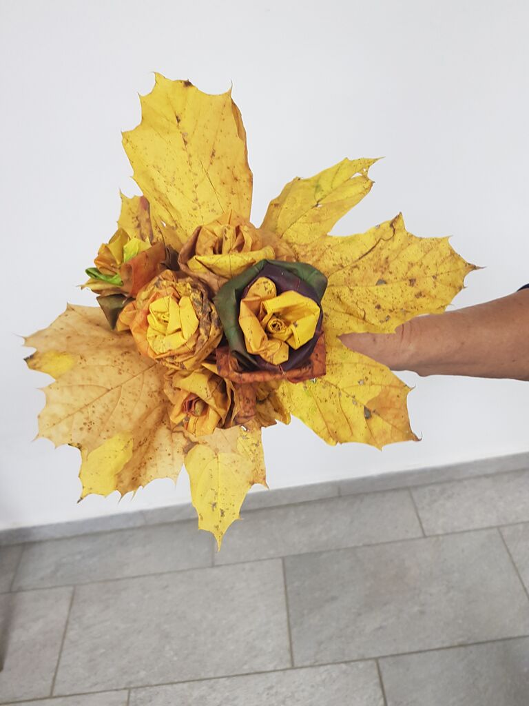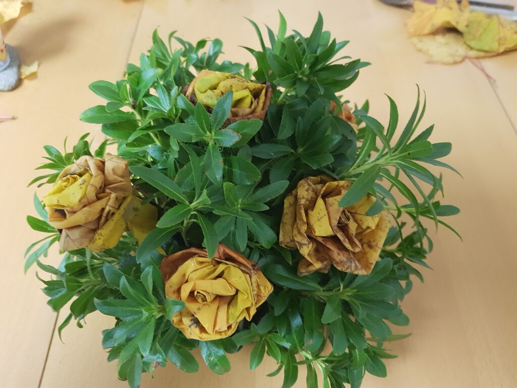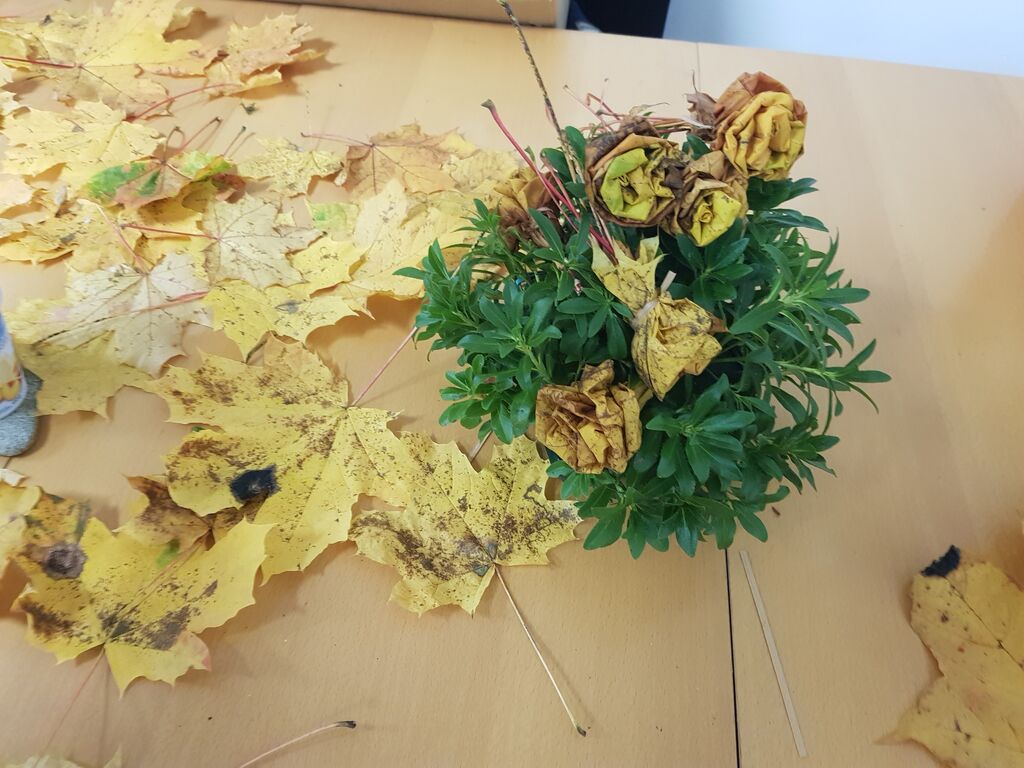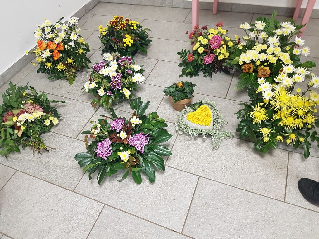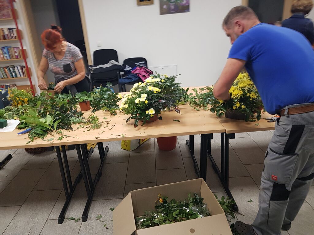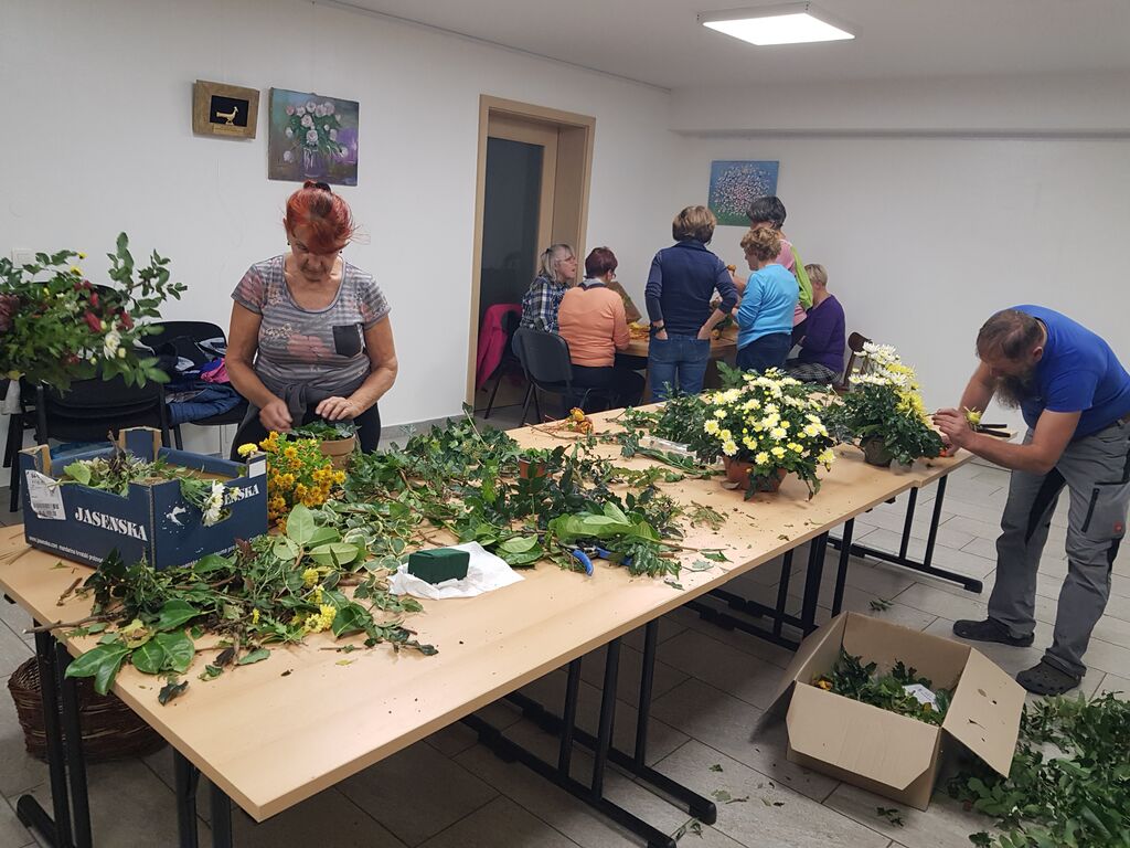 Letos je bila delavnica v Domu krajanov zelo obiskana. Davorin je vodil izdelavo ikeban in nagrobnih aranžmajev, za katere so prisotni uporabljali zelenje in krizanteme. Kot novost je Francka Srna predstavila izdelavo cvetja iz javorjevih listov.