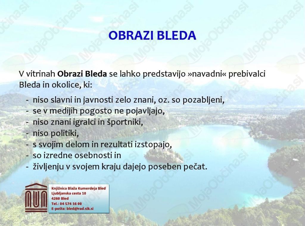Knjižnica Blaža Kumerdeja Bled začenja z Obrazi Bleda, kjer lahko v vitrinah "navadni" prebivalci Bleda in okolice predstavijo svoje življenje in delo ali nam ga zaupajo na večerni prireditvi.