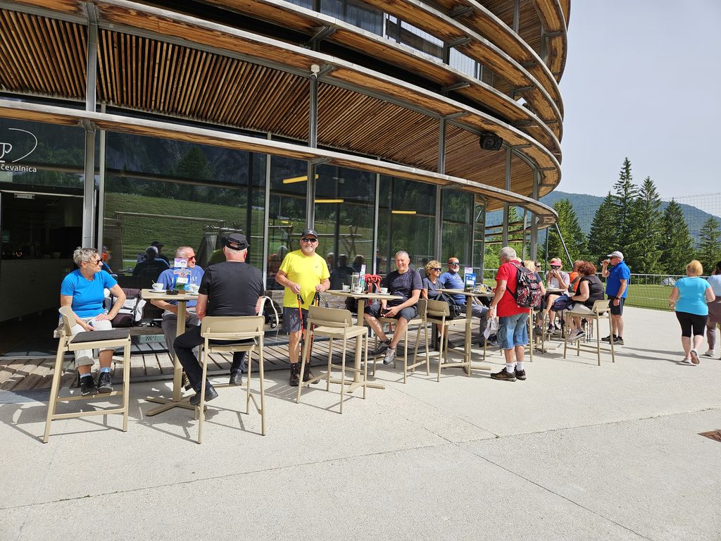 Po prijetnem sprehodu do Planice smo si privoščili kavo in si ogledali ves rekreacijski center z vsemi skakalnicami in ostalimi objekti, pa tudi muzej. Po kratkem predahu smo nadaljevali proti objektu Čaplja in se s sedežnico odpeljali na vrh velikanke. Po ogledu srhljive strmine zaleta, nekateri smo ga videli prvič, smo pot nadaljevali po makadamski cesti do bivše karavle JLA Slatna. Tam smo obudili spomin na dogodke leta 1991 in s tem počastili dan državnosti in dan policije. Pot smo nadaljevali nazaj do izhodišča v Ratečah. Pohod se je zaključil z odlično malico v restavraciji Veranda v Mojstrani.