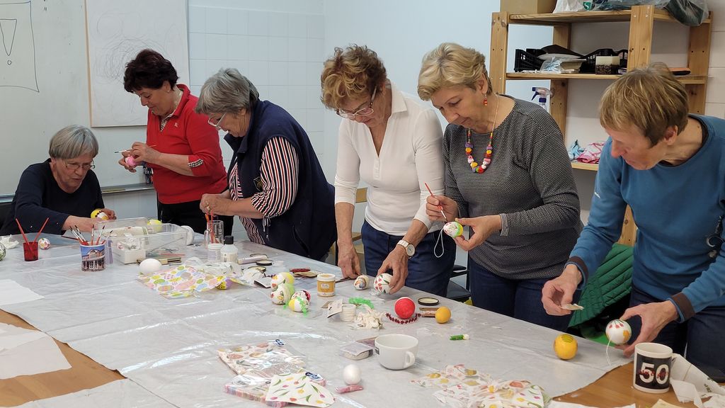 Teden kasneje smo izvedli našo tradicionalno delavnico krašenja pirhov. Odziv naših članic je bil velik in udeležba prav tako. Izdelovali smo pirhe v tehniki »decoupage« in pod vodstvom mentorice Mete Kenda so nastali čudoviti izdelki, ki smo jih, letos prvič, postavili na ogled. Razstavo smo v sodelovanju s Triglavskim narodnim parkom postavili v Infocentru Triglavska roža Bled. Razstavljeni so bili čudoviti pirhi Mete Kenda in tudi pirhi z letošnje delavnice, ki so jih izdelale naše članice, udeleženke delavnice. Z namenom obujanja starih običajev smo na velikonočno soboto pripravili »pirhanje«, stare igre s pirhi – valjanje in sekanje pirhov in tako imenovano »štrucanje«, ki se jih vsi še prav dobro spomnimo iz otroških let. Zabavali so se tako najmlajši kot tudi malo manj mladi. Ob tem gre posebna zahvala blejskim hotelom Sava, Astoria, Triglav, Bled Rose in Ribno, ki so za ta dogodek pobarvali skoraj 200 pirhov.