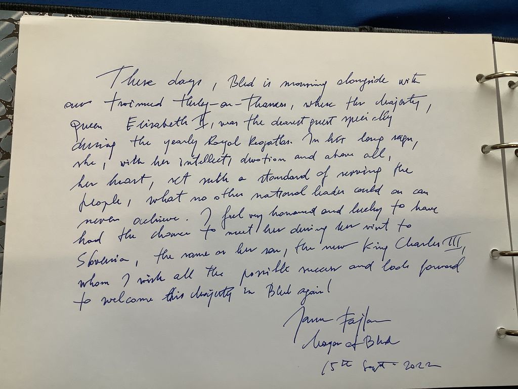 Župan Občine Bled se je včeraj podpisal v žalno knjigo kraljice Elizabete II. V znak spoštovanja do pobratene občine Henley-on-Thames iz Velike Britanije bo v ponedeljek v času pogreba preminule angleške kraljice pred Občino Bled spuščena zastava. Obenem bo na željo Veleposlaništva Združenega kraljestva Velike Britanije in Severne Irske med 20. in 21. uro v počastitev kraljici osvetljena grajska skala.