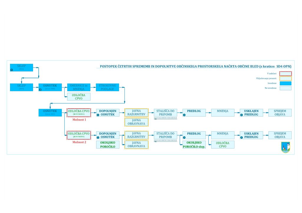 Postopek je trenutno v fazi pridobivanja Odločbe o tem, ali je za postopek SD4 OPN potrebno izvesti Celovito presojo vplivov na okolje (s kratico CPVO) in ob tem izdelati Okoljsko poročilo, ali, za namen tega postopka, to morda ni potrebno. Potek postopka je prikazan v priloženi shemi.