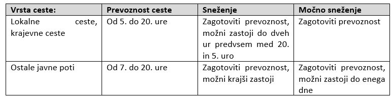 Prevoznost je skladno s pravilnikom zagotovljena, če višina snega na občinskih javnih cestah ne presega 15 cm, promet pa je možen z uporabo zimske opreme vozil. Na odsekih cest z vzdolžnim naklonom nad 10 odstotkov se šteje, da je prevoznost zagotovljena tudi, če je promet možen samo z uporabo snežnih verig.