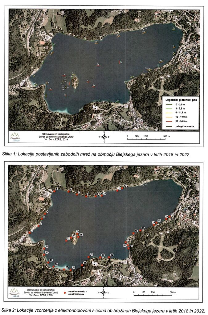 Obveščamo vas, da bo ZZRS v času od vključno 22. 9. do 26. 9. 2025 izvajal monitoring rib z dvema metodama vzorčenja, in sicer s pridnenimi in pelagičnimi zabodnimi mrežami (postavljanje s čolna) ter z elektoribolovom s čolna. Posamezna mreža je dolga 30 m; mreže bodo v vodi 12 ur preko noči; polaganje mrež se bo vršilo zvečer, dvigovanje pa naslednje jutro. Za vzorčenje bo uporabiljenih 40 mrež. Lokacije mrež bodo podobne lokacijam, na katerih so bile mreže postaviljene leta 2018 in 2022 (Slika 1).