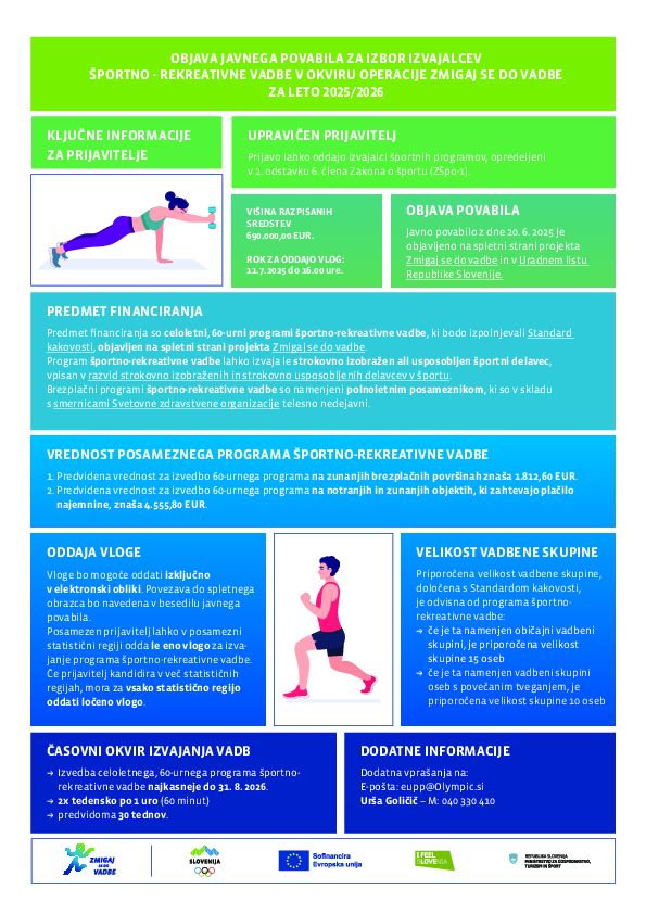 Olimpijski komite Slovenije – Združenje športnih zvez vabi izvajalce vadb v vseh slovenskih regijah, tudi na Gorenjskem, da se odzovejo na Javno povabilo za izbor izvajalcev vadb v okviru projekta Zmigaj se do vadbe za obdobje 2025/26. Izbrani programi športno-rekreativne vadbe bodo namenjen športni aktivaciji gibalno neaktivnih odraslih. V okviru projekta, ki bo sicer potekal do leta 2028, želi Olimpijski komite Slovenije v programe vadb vključiti čim večje število neaktivnih odraslih prebivalcev Slovenije, za katere bodo vadbe brezplačne. Skupna vrednost projekta znaša 4,4 milijona evrov; sofinancirata ga Evropska unija iz Evropskega socialnega sklada plus (ESS+) in Ministrstvo za gospodarstvo, turizem in šport.