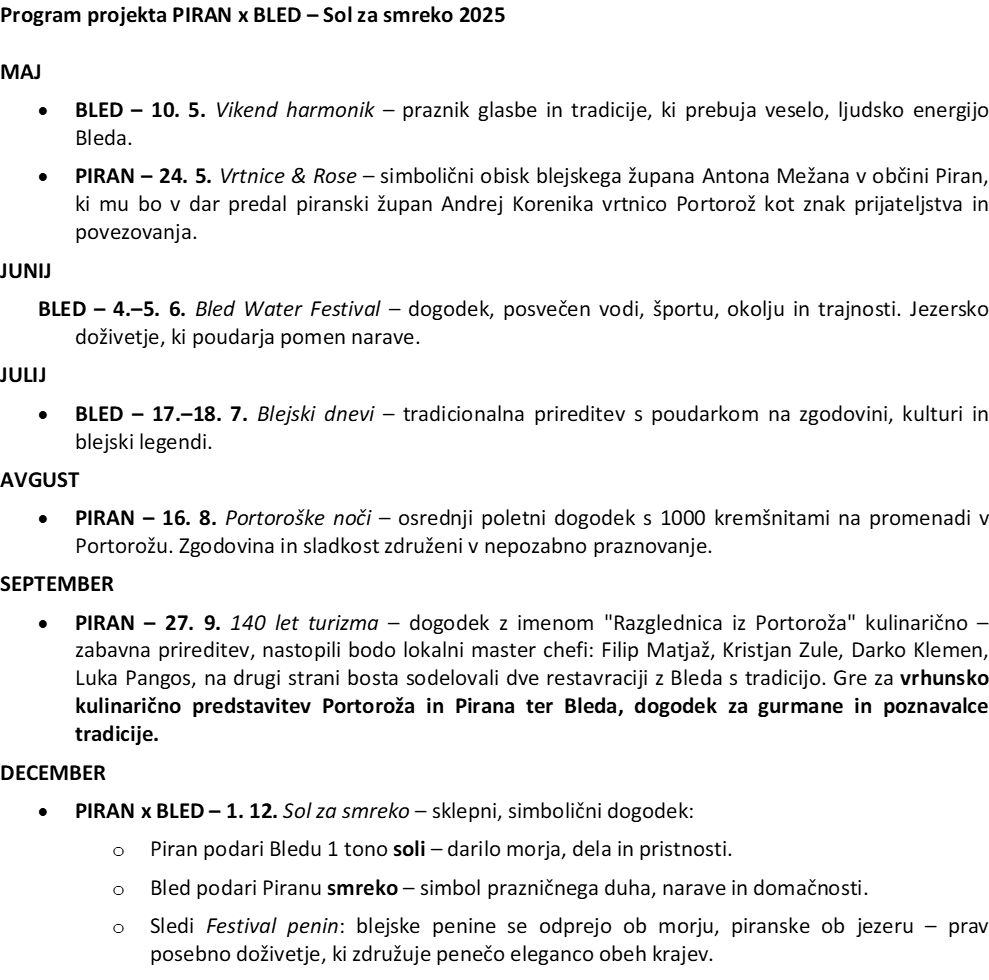 Projekt temelji na povezovanju kulturne dediščine, lokalnih posebnosti in trajnostnega razvoja. V ospredju je simbolna vez med soljo, darilom obale, in smreko, simbolom prazničnega duha z gora. V sklopu projekta bo letos izvedenih osem skupnih dogodkov, štirje na Bledu in štirje v občini Piran – z vsebinami, ki nagovarjajo tako domače kot tuje goste.