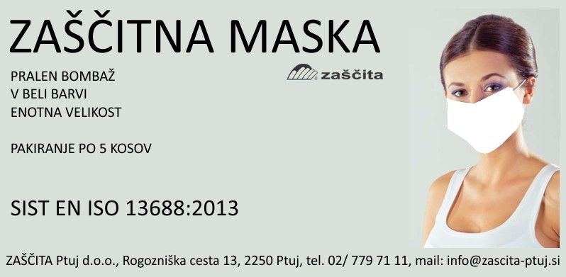 Iz uprave za zaščito in reševanje so občinskim štabom civilne zaščite sporočili, da podjetje Zaščita Ptuj proizvaja zaščitno opremo, in sicer pralne zaščitne kombinezone in maske iz blaga, rokavice, druga zaščitna sredstva in podobno. Artikli ustrezajo standardu EN ISO 13688:2013. Kontakt: Tel 02 779 71 11, info@zascita-ptuj.si