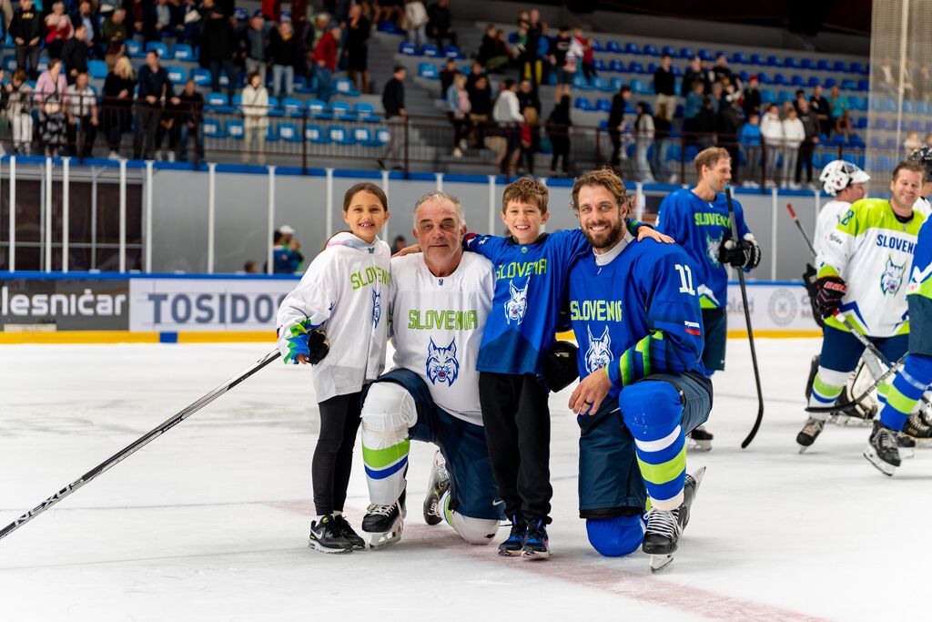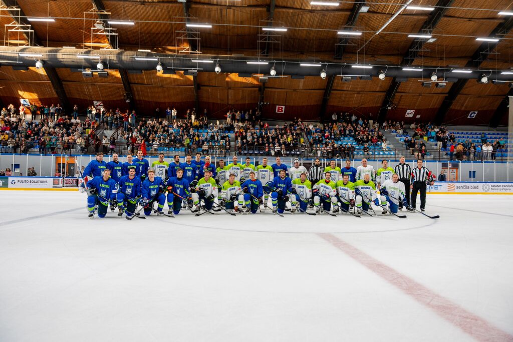 Najboljši slovenski hokejisti vseh časov so premierno zavzeli blejsko ledno ploskev, kjer so slavili mladi s petimi zadetki v gol starejših hokejskih kolegov.