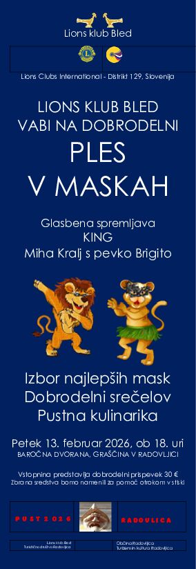Vabimo vas, da se udeležite plesa v maskah, ki bo v petek,13.02.2026 ob 18.00 v Baročni dvorani Graščine v Radovljici. Ples organizira Lions klub Bled z dobrodelnim srečelovom in dobro glasbo. Najlepše maske bodo nagrajene. Vstopnina 30 EUR bo predstavljala dobrodelni prispevek za pomoč otrokom v stiski.