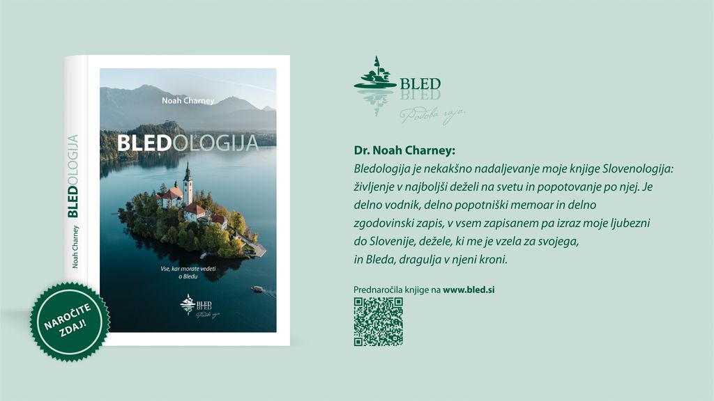 Bledologija: vse, kar morate vedeti o Bledu, je delo avtorja Noaha Charneyja, lanskoletnega ambasadorja slovenskega turizma, Američana, ki se je najprej zaljubil v Slovenko, nato pa še v Slovenijo. Knjiga skozi 240 strani popelje v osrčje ene najlepših evropskih destinacij – v skrite kotičke in zgodbe očarljivih domačinov in predstavi 50 idej za doživetja na Bledu in okoliških vaseh. Med drugim odstira pogled v skrite kotičke, kot je prava blejska kraška Jama pod Babjim zobom, izjemno doživetje veslanje z olimpijci v osmercu, pokušino tepkinih dobrot v Zasipu, degustacijo žganja na kmetiji Tersegvav, doživetje Vrta okusov, raziskovanje Pokljuške soteske in Poglejske cerkve, ki prepriča predvsem plezalce. V knjigi boste našli tudi poglavja z vodenimi sprehodi po Blejskem otoku in gradu, gastronomski vodnik po Bledu, ki vključuje tudi recepte, pa ideje za družinski oddih ter predlagane programe raziskovanja kraja za različne dolžine bivanja.