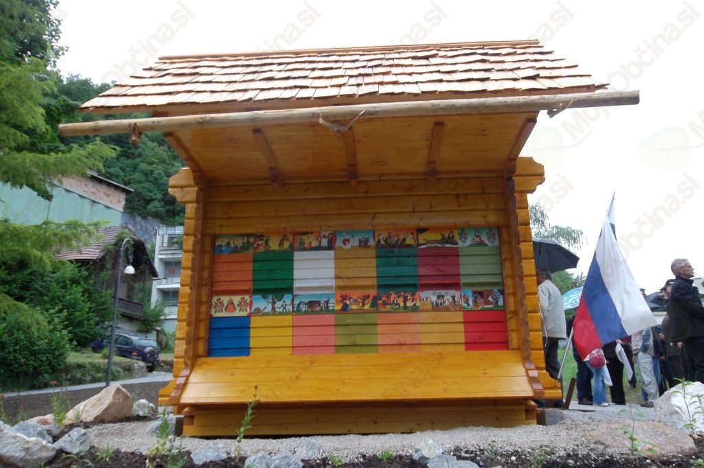 Čebelarsko društvo Bled - Gorje ima tako v Zdraviliškem parku čebelnjak, zgrajen v blejskem stilu, takem, kot so bili čebelnjaki po blejskih vaseh zgrajeni v starih časih, sam čebelnjak bo služil kot društvena prodajalna medu, do njega pa od jezera po medoviti poti vodi dva tisoč trajnic, medovitih rastlin, ki pomagajo čebelam preživeti. Panjske končnice je po izboru župana Janeza Fajfarja poslikala soproga Blaža Ambrožiča, Danijela Jovanovič. Skalnjak ob čebelnjaku je postavljen tako, da sam čebelnjak delno varuje in preprečuje neposreden kontakt s čebelami, aktivnih je šest panjev, naseljen je eden. Čebelnjak je v celoti lesen in pokrit s skodlami.