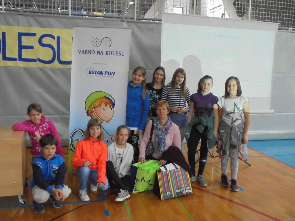 Petošolci so se z učiteljico Meto Skumavec jeseni udeležili razpisa Varno na kolesu na pobudo družbe Butan Plin in partnerjev. Na šolskih poteh so poiskali nevarne točke in jih predstavili lokalni skupnosti in izrazili njihova razmišljanja in želje glede varnega kolesarjenja v šolo in domov. Izdelali so družabno  igro, v kateri utrjujejo in ponavljajo prometne predpise in pravila za kolesarje. V šolo so ves mesec marec prihajali peš ali s kolesom.  Pri peš hoji so se jim pridružili tudi mlajši učenci in celo starši, stari starši, kar nas izredno veseli. Skupaj so oblikovali in izdelali zloženko o varnem in zdravem kolesarjenju. Pri likovni podobi zloženke sta njuna likovna talenta združili Karin Pesrl in njena babica Erika. Raziskavo, družabno igro in zloženko si je ogledala komisija in ocenila njihovo delo. V torek, 11. aprila, so se petošolci z učiteljicama Meto Skumavec in Meri Poklukar udeležili regionalnega srečanja programa Varno na kolesu na OŠ Šenčur. Na prireditvi so mentorjem podelili priznanja in učencem simbolne nagrade. Z različnimi sogovorniki smo se pogovarjali o varnosti kolesarjev in priložnostih za še varnejše poti v prometu. Po srečanju so se učenci lahko aktivno udeležili različnih kolesarsko obarvanih vsebin. Na zaključno prireditev v Ljubljani se nismo uvrstili, smo pa ponosni, da smo se veliko novega naučili in bomo pridobljeno znanje s   pridom uporabili v vsakdanjem življenju. Tako kot je dejal nekdo izmed govornikov, zmagovalci smo vsi, ki se vsak dan varno srečujemo in družimo v prometu peš, s kolesom ali z avtom.