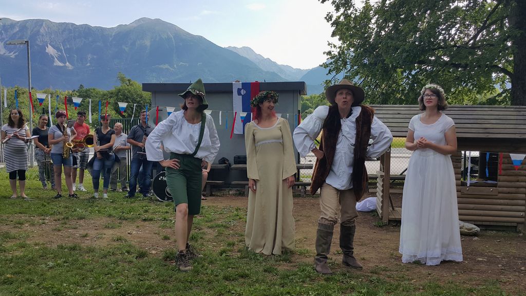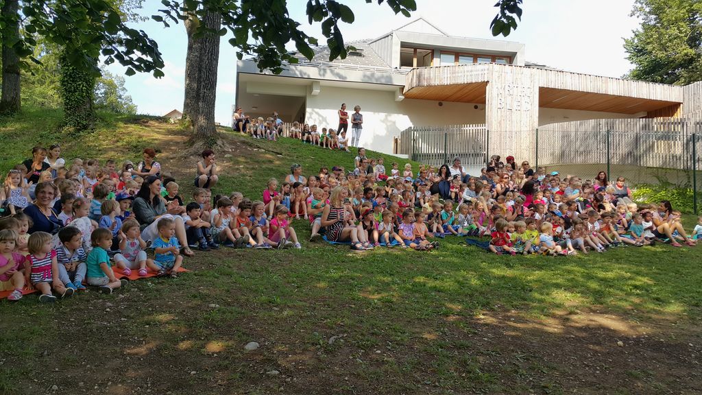 Bled - Konec junija smo z otroki praznovali dan državnosti. Imeli smo proslavo na prostem, kjer sta otroke obiskala slovenska literarna junaka Peter Klepec in Martin Krpan. Proslavo so z glasbenim programom popestrili člani Godbe Lesce, katerim se iskreno zahvaljujemo. Kot se za praznovanje spodobi, smo se na koncu še pogostili, in sicer z osvežujočim sladoledom.