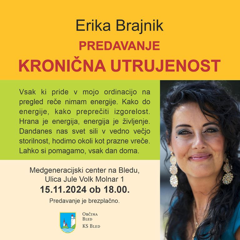 Krajevna skupnost Bled organizira predavanje Erike Brajnik na temo Kronična utrujenost. Predavanje bo potekalo 15. 11. 2024 ob 18.00 v Medgeneracijskem centru na Bledu. Vabljeni. Predavanje je brezplačno.