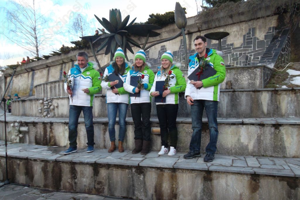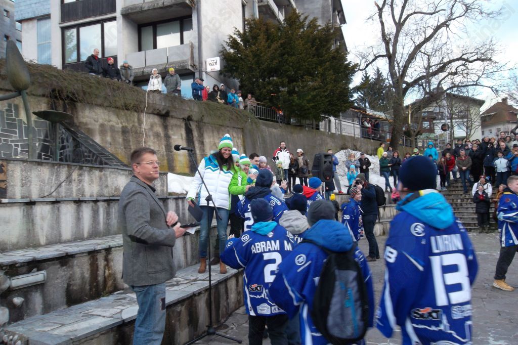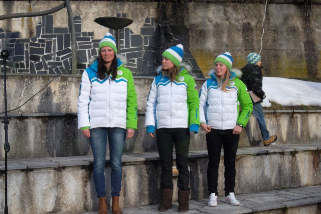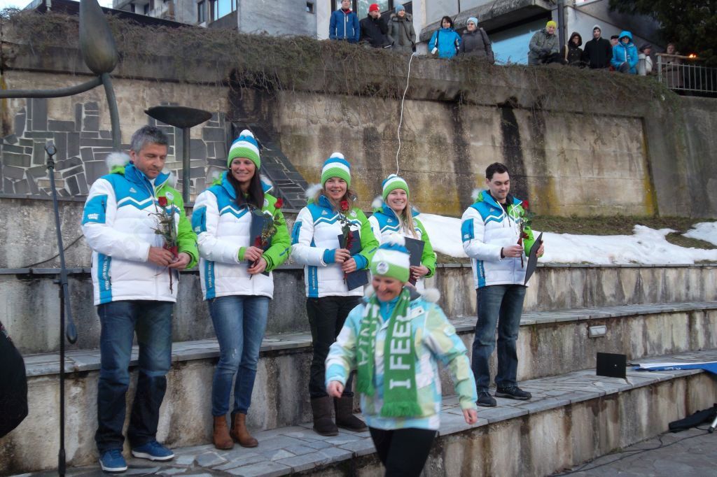 Športnike in njihove spremljevalce, z Bleda je namreč tudi reprezentančni zdravnik, serviser in fizioterapevtka, je pozdravila navdušena množica domačinov z Godbo Gorje na čelu. Pozdravil jih je tudi župan Janez Fajfar: