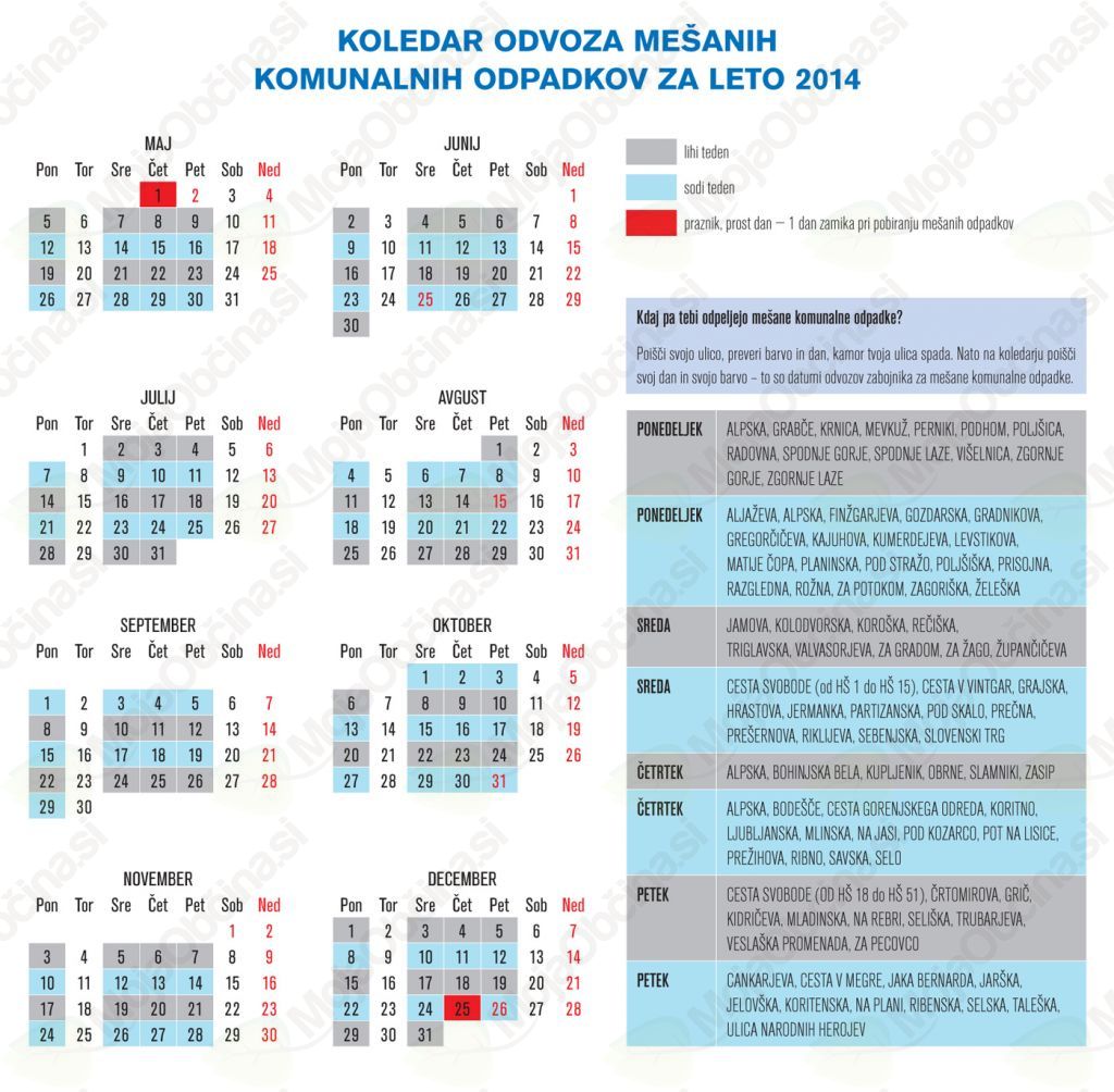Odvoz mešanih komunalnih odpadkov bo od 4. maja potekal vsakih 14 dni in ne več tedensko. Možne izjeme so samo večji večstanovanjski objekti – bloki in pogodbeni uporabniki, javne ustanove in podjetja, kjer bodo odvozi potekali v skladu z dogovorom ali potrebami. Termini odvozov po posameznih naseljih oz. ulicah so predstavljeni v Koledarju odvoza mešanih komunalnih odpadkov. Seznam uporabnikov, kjer se bodo odvozi še vedno izvajali tedensko oz. po dogovoru, je objavljen na spletni strani www.ibled.si. Pogodbeni uporabniki lahko potrebo po pogostejšem odvozu predlagajo v sprejemni pisarni Infastrukture Bled d.o.o. ali po tel.: 04 5780 535, 04 5780 512.