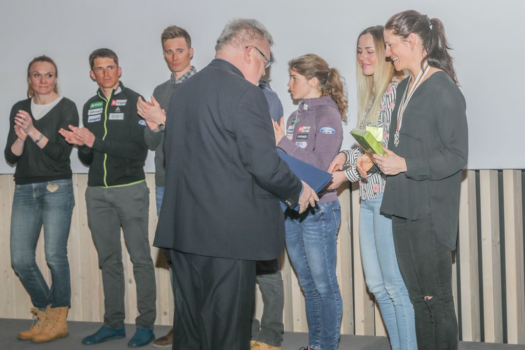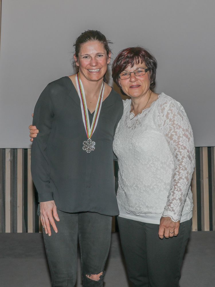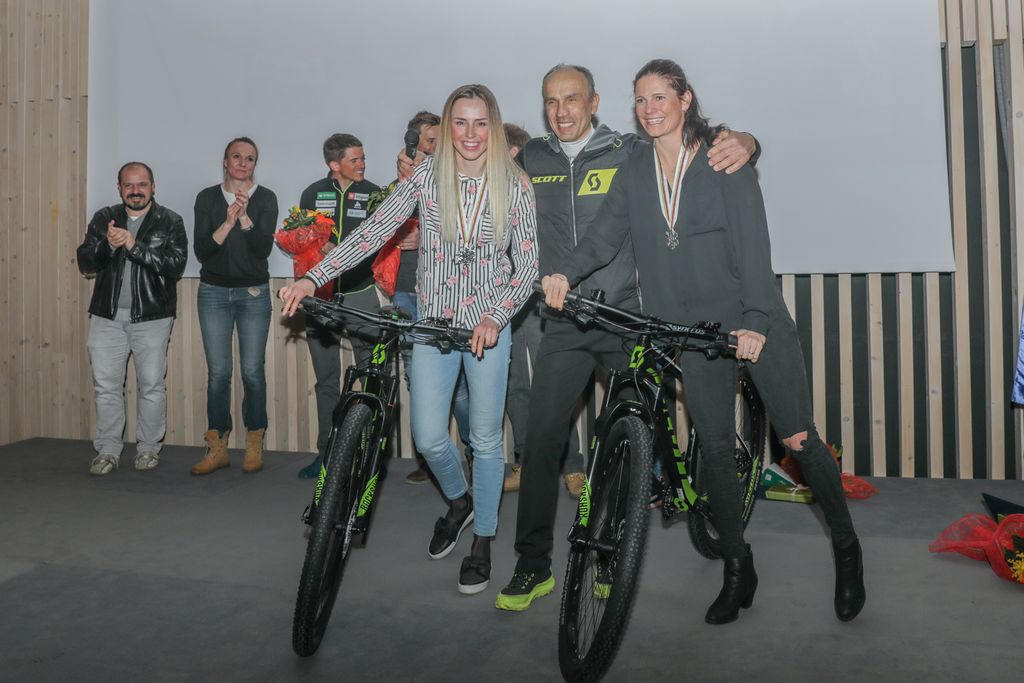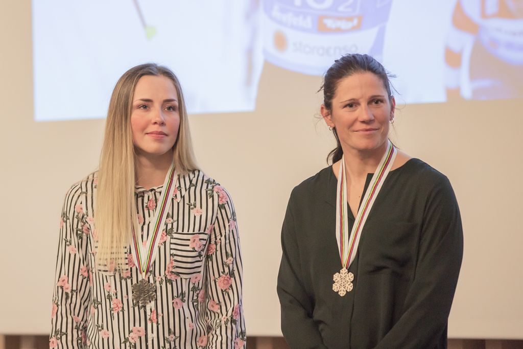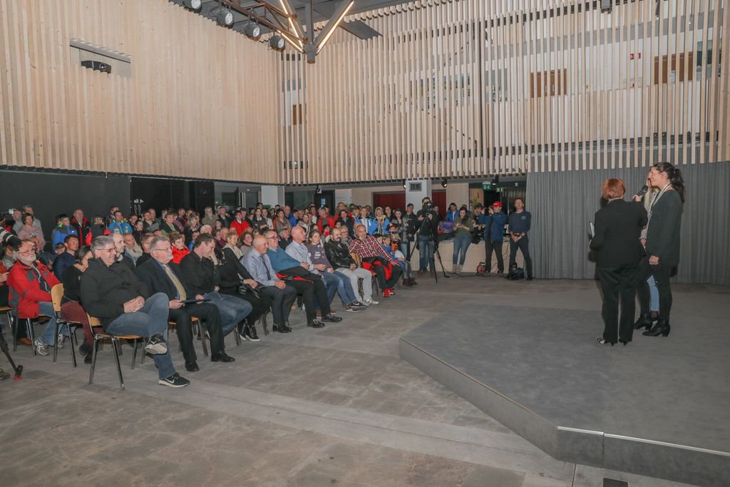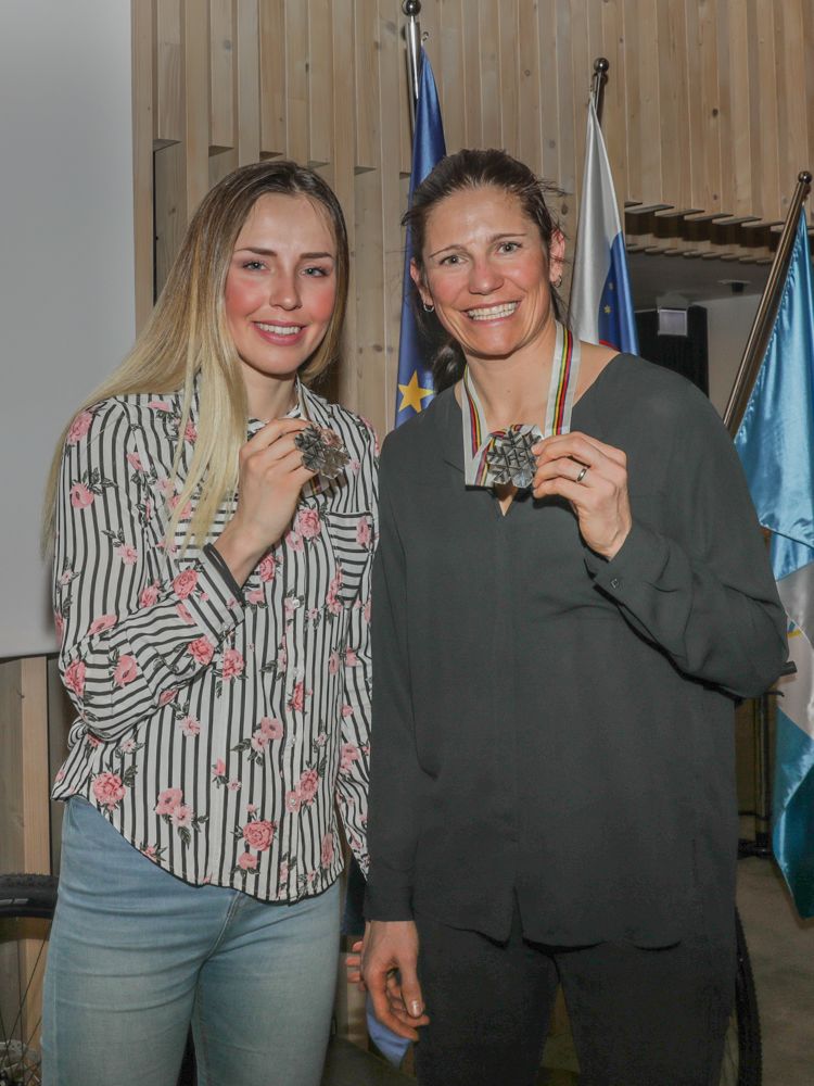 Sinoči je pred res veliko množico prijateljev, sorodnikov in športnih navdušencev v Infocentru Triglavska roža na Bledu potekal sprejem za srebrni Katjo Višnar in Anomarijo Lampič. Pridužili so se jim še domačinka Alenka Čebašek in velik del slovenske tekaške reprezentance s trenerji na čelu, vodstvo Tekaško smučarskega kluba Bled, dolgoletni trener Vinko Poklukar in zdravnik Janez Poklukar, predsedniik Zbora za tek na smučeh pri SZS Simon Jan, blejski župan Janez Fajfar, dogodka pa se je udeležil tudi minister za notranje zadeve, prav tako domačin Boštjan Poklukar.