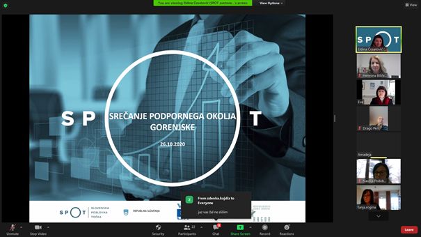 Srečanje je bilo izvedeno zaradi poostrenih ukrepov on-line preko aplikacije ZOOM. Srečanja se je udeležilo 20 udeležencev iz različnih institucij na Gorenjskem in vodja projekta SPOT svetovanje ga. Ida Praček iz SPIRIT, javne agencije.
