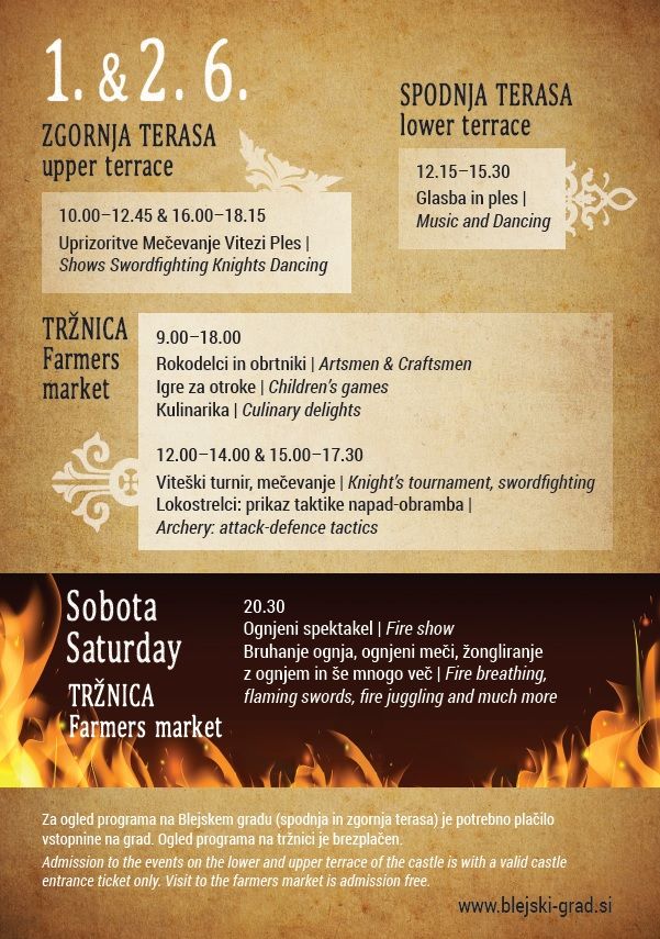 V soboto in nedeljo bodo na Blejskem gradu srednjeveški dnevi. Na ogled bo tržnica, predstavljali se bodo rokodelci in obrtniki, na sporedu bodo igre za otroke in kulinarične dobrote. Viteški turnirji bodo na sporedu med 12. in 14. uro ter med 15. in 17.30. Na spodnji grajski terasi bosta glasba in ples od 12h15 do 15h30, igrane uprizoritve viteških iger pa bodo na zgornji terasi od 10h do 12h45 in od 16h do 18h15.