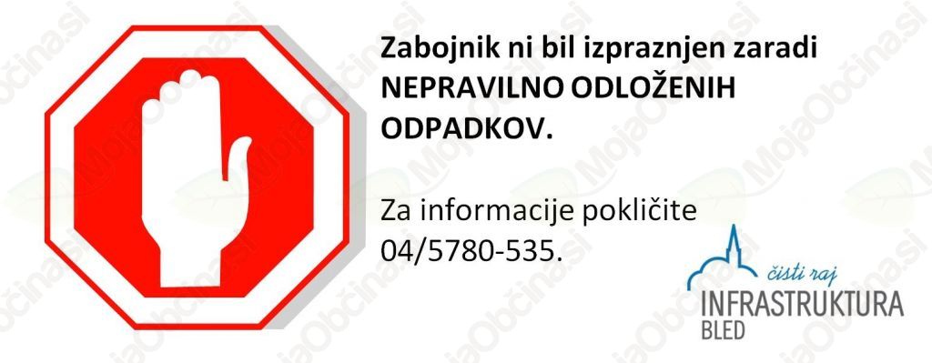 Bled - Infrastruktura Bled d.o.o. je v preteklem mesecu začela z akcijo STOP: nepravilno odloženi odpadki. To pomeni, da zabojnikov, v katerih bodo nepravilno odloženi odpadki, ne bomo izpraznili. Prvi korak je obvestilo, ki bo zataknjeno za pokrov zabojnika. V kolikor se bo nepravilno odlaganje odpadkov nadaljevalo, bodo kršitelji kaznovani skladno z Odlokom o načinu opravljanja obvezne lokalne gospodarske javne službe ravnanja s komunalnimi odpadki.