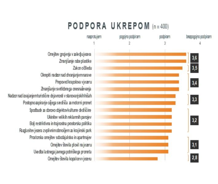 Znotraj posameznih področij je bilo v odgovorih na anketo podanih veliko konkretnih ukrepov in idej za uvajanje pozitivnih sprememb. Za uspešno izvajanje okoljsko in družbeno dolgoročno vzdržnega modela razvoja občine ste izpostavili zlasti nujnost še učinkovitejšega upravljanja turističnih in prometnih tokov ter dviga kakovosti v turizmu na račun zmanjšanja obsega. Pospešeni izvedbi celovite sanacije Blejskega jezera naj sledi sprejetje sistemskih ukrepov za preprečevanje vsakršnega nadaljnjega onesnaževanja naravnih površin in ekosistemov. Pri tem je bilo doseženo visoko soglasje o uvedbi strožjih režimov rabe jezera.