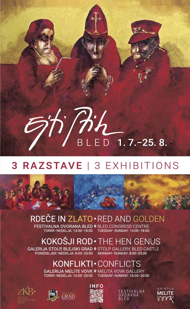 Do konca avgusta bodo na Bledu na ogled tri razstave Ejti Štih, in sicer Rdeče in zlato v Festivalni dvorani Bled, Konflikti v Galeriji Melite Vovk in Kokošji rod v Galeriji Stolp na Blejskem gradu.