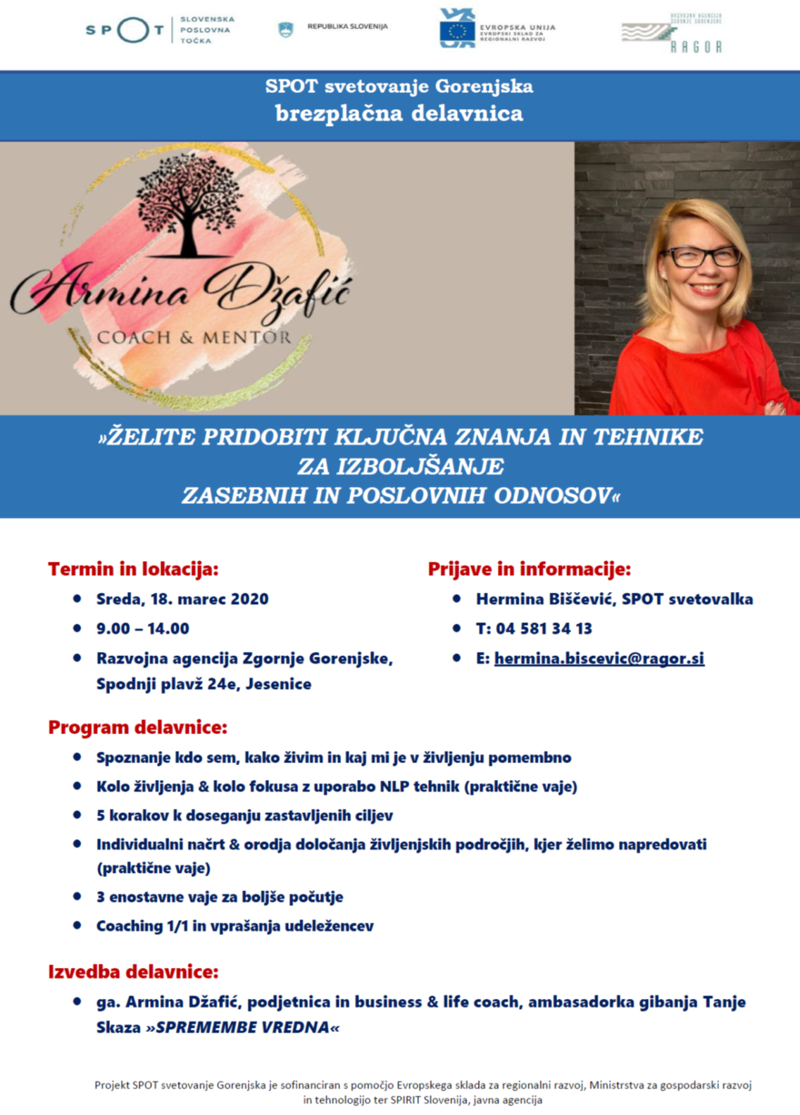 - »ŽELITE PRIDOBITI KLJUČNA ZNANJA IN TEHNIKE ZA IZBOLJŠANJE ZASEBNIH IN POSLOVNIH ODNOSOV«, ki bo v sredo dne 18.03.2020 od 9:00 – 14.00 ure, na Razvojni agenciji Zgornje Gorenjske, Spodnji Plavž 24E, Jesenice. Predavateljica je ga. Armina Džafić, podjetnica in business & life coach, ambasadorka gibanja Tanje Skaza »SPREMEMBE VREDNA«