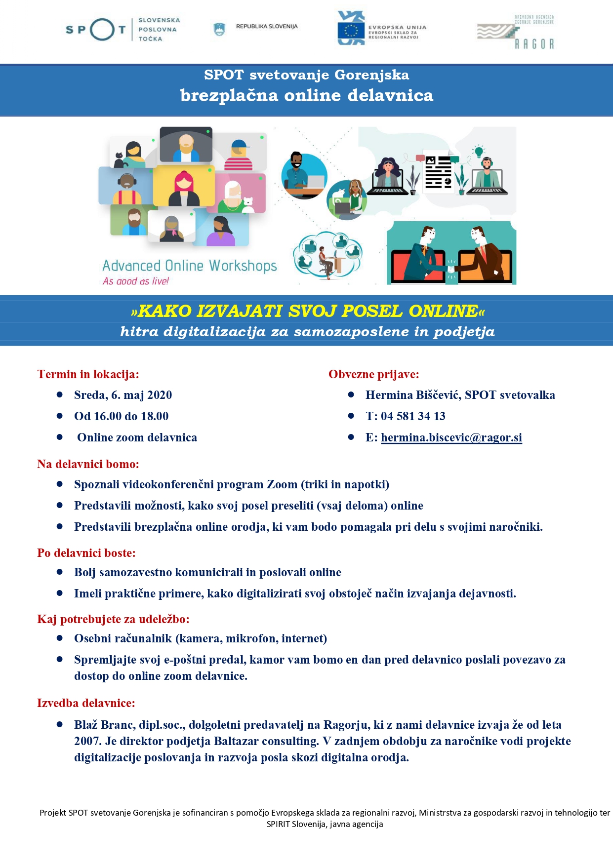 Opis dogodka: Razvojna agencija Zgornje Gorenjske v okviru SPOT svetovanje Gorenjska vabi na brezplačno online delavnico z naslovom »KAKO IZVAJATI SVOJ POSEL ONLINE - hitra digitalizacija za samozaposlene in podjetja«