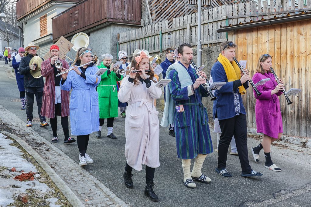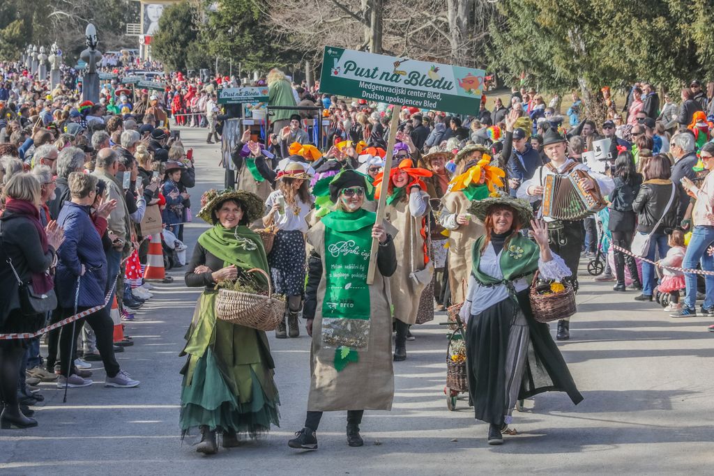 Na letošnji pustni povorki se bodo tradicionalno predstavile skupinske maske, med drugim se bodo v povorki sprehodili blejski labodi in fijakerji, s(e)rčne in pogumne Blejke ter grajski tolkalci. Skupinska maska bo pripovedovala tudi legendo o nastanku jezera, pogledala v prihodnost z Evropskim kraljevim forumom 2025 ter v preteklost z odprtjem legendarnega hotela Toplice. Predstavljana bo tudi zgodba legende, ki živi v koči pod Babjim zobom, Florjana-Svedrarja, o njegovih prividih o zemlji, ki jo je razrila granata, o truplih oblitih s krvjo in vojnimi prikaznimi. Na povorki bomo spoznali tudi bodoče blejske legende, del sprevoda bosta tudi hoduljarja, Godba Gorje z mažoretkami ter kurenti s Ptuja.