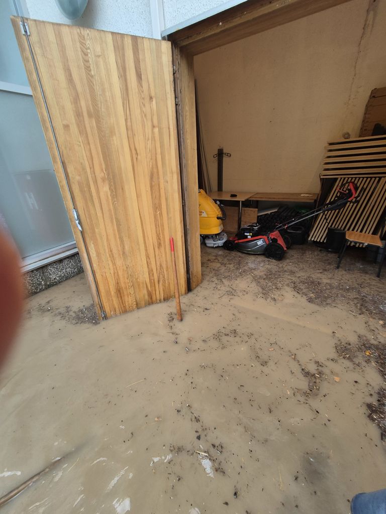 Proti poldnevu se je nebo pooblačilo, Bled je zajela nevihta z močnimi nalivi. V dvorano je začela prodirati voda, ki je iz smeri Ledene dvorane prihrumela kot hudournik. V pritličju in kleti je voda vztrajno naraščala. Imeli smo srečo, da se je vse dogajalo v delovnem času, ko smo bili v pisarnah in zaposleni ter postavljavci razstave, bratje Poklukar, smo takoj začeli z reševanjem situacije.