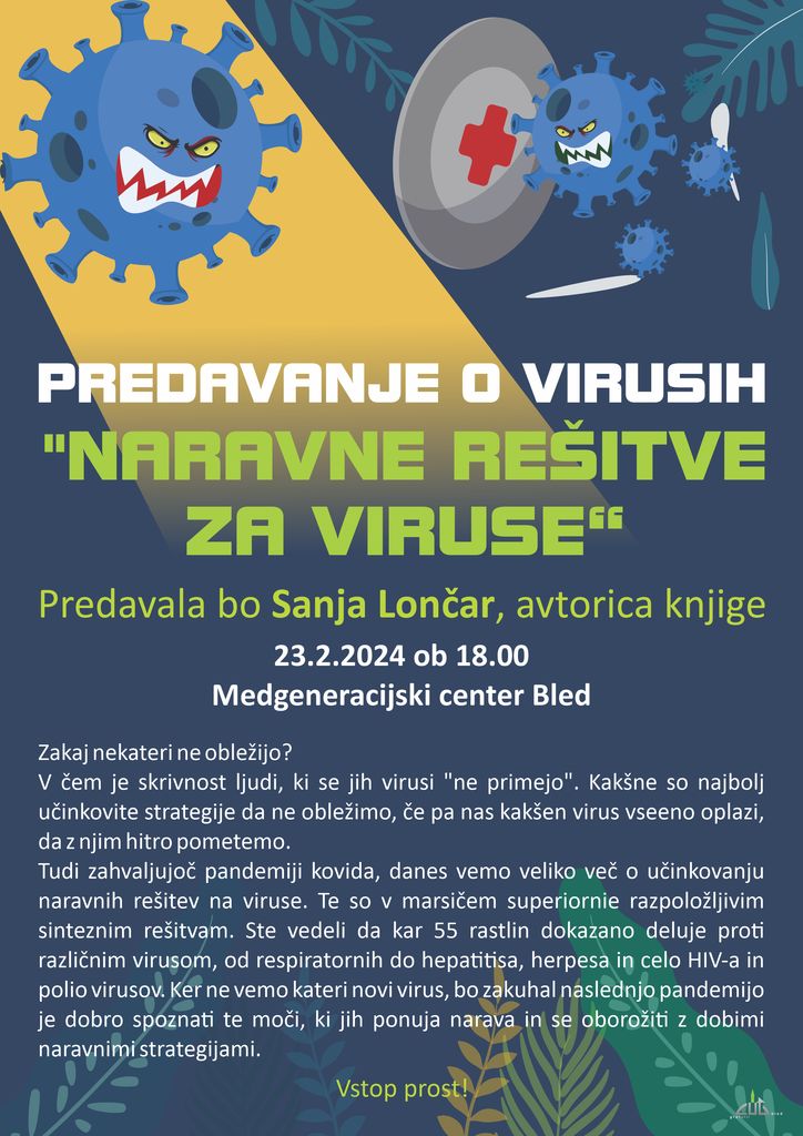 KS Bled organizira predavanje Sanje Lončar na temo o virusih. Predavala bo o tem v čem je skrivnosti ljudi, ki se jih virusi " ne primejo". Kakšne so najbolj učinkovite strategije, da ne obležimo, če pa nas kakšen virus vseeno oplazi, da z njim hitro pometemo. Predavanje bo potekalo v Medgeneracijskem centru Bled, 23.2.2024 ob 18.00 uri. Vstop prost.