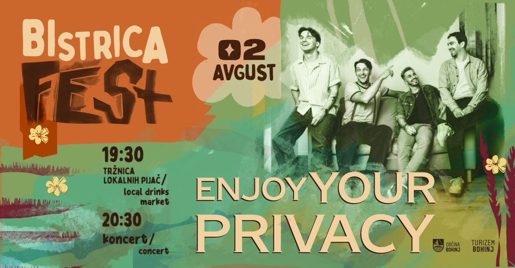 Ko se kozarec napolni z okusi Bohinja, oder zavzame skupina Enjoy Your Privacy (EYP). Energija, iskrenost in melodični pop-rock prepletajo zgodbe o ljubezni, mladosti in iskanju sebe. Gorenjska zasedba s svežo močjo stopa v novo ustvarjalno obdobje in bo predstavila tudi nove skladbe iz prihajajočega albuma.