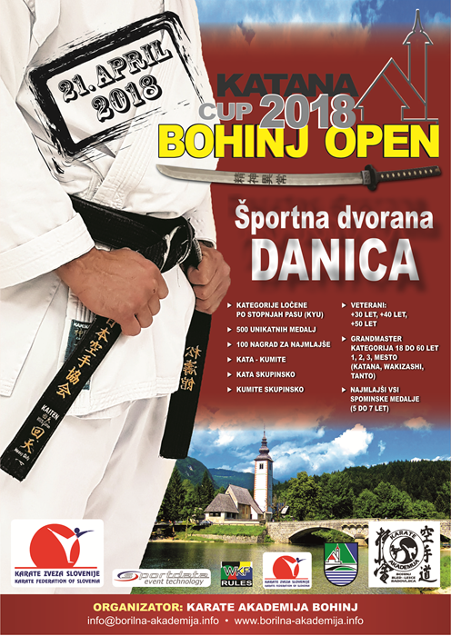 KARATE AKADEMIJA BOHINJ letos že šesto leto uspešno organizira tekmovanje mladih karateistov Slovenije in tudi tujine, KATANA CUP BOHINJ OPEN 2018.V soboto 21.04. od 10.00 ure dalje vabljeni v dvorano Danica k ogledu nastopov mladih karateistov v borbah za medalje. Za starejše mladince in veterane pa so v posebnih kategorijah pripravljene katane.