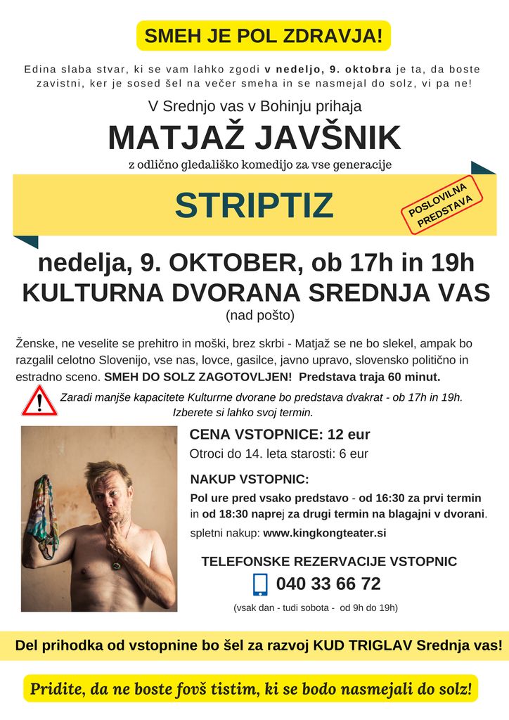 Kontaktni podatki organizatorja: Kud Triglav Srednja Vas V Bohinju, 041 390 285.
