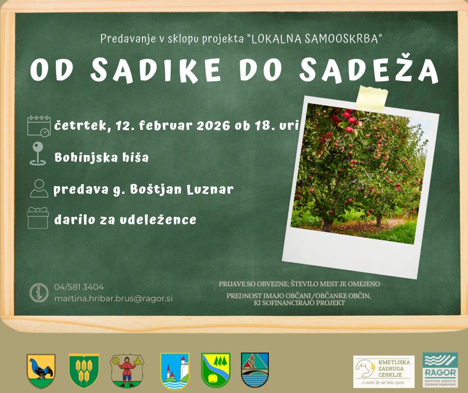 V sklopu projekta LOKALNA SAMOOSKRBA, ki ga sofinancirajo občine Kranjska Gora, Žirovnica, Radovljica, Bled, Bohinj in Gorje vabimo na predavanje "OD SADIKE DO SADEŽA".
