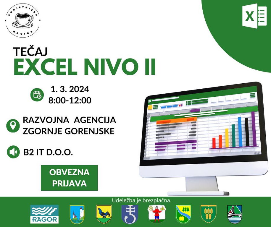 EXCEL NIVO II v petek, 1. 3. 2024 od 8:00- 12:00 na Razvojni agenciji Zgornje Gorenjske