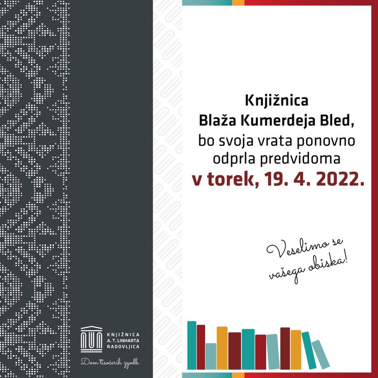 obveščamo vas, da bo Knjižnica Blaža Kumerdeja Bled, zaradi tehničnih težav, svoja vrata za izposojo in vračilo gradiva ponovno odprla predvidoma v torek, 19. 4. 2022.