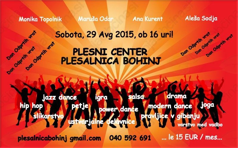 V soboto, 29. avgusta, so bodo ob 16. uri pred glavnim vhodom Kulturnega doma Joža Ažman ob otvoritvi plesnega centra zbrali plesalci in plesalke Plasalnice Bohinj.