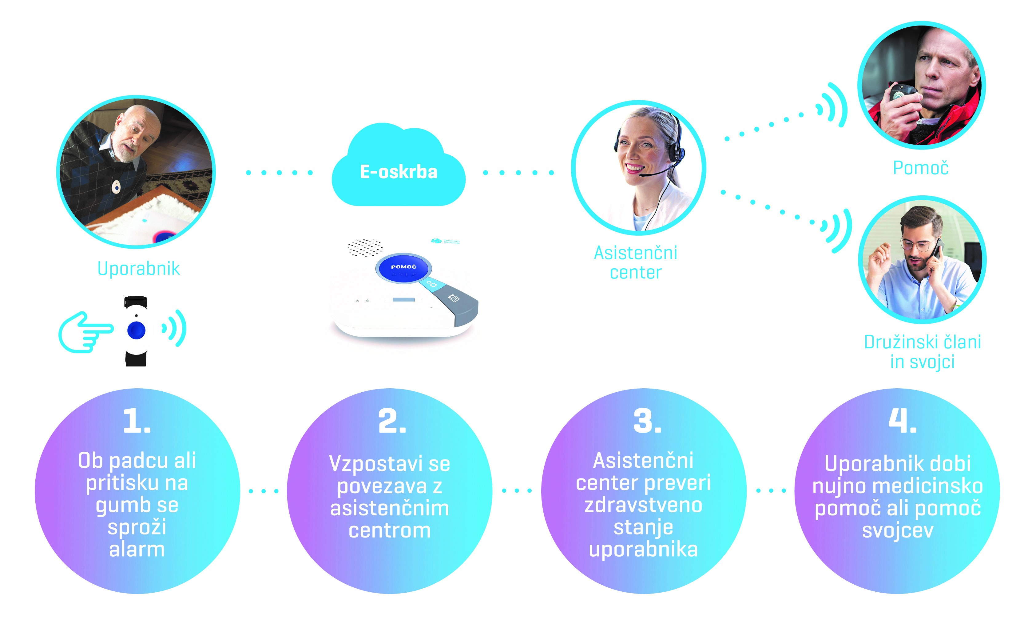 E-oskrba uporabnikom omogoča, da ostanejo v domačem okolju dlje časa, hkrati pa svojcem prinaša večjo brezskrbnost, saj vedo, da so njihovi najbližji varni. Storitev deluje neprekinjeno, vse dni v letu, v skladu z mednarodnimi standardi za varnost in zanesljivost.