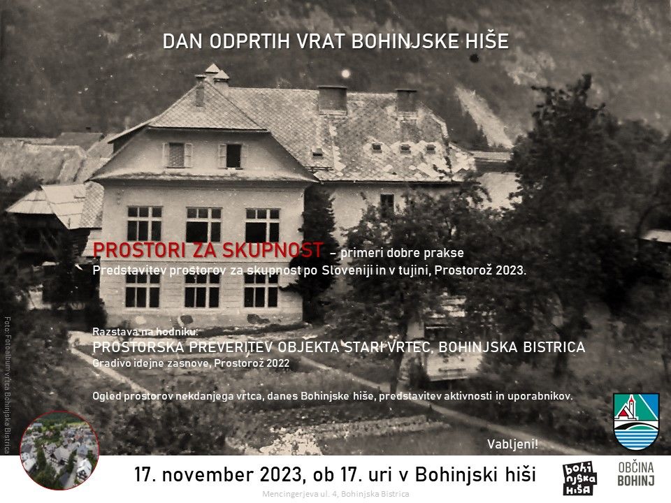 Tema predstavitve o skupnostnih prostorih se nanaša na jeseni leta 2022 izdelano idejno zasnovo in dokumentacijo prostorske preveritve objekta starega vrtca v Bohinjski Bistrici, ki jo je naročila Občina Bohinj za namen medgeneracijskega centra, knjižnice ali centra skupnosti. Ekipa Prostoroža je v okviru projektne naloge preverila različne možnosti, izdelala oceno investicije, predlagala različne programe, ki bi se v hiši odvijali lahko dolgoročno in hkrati predlagala začasno rabo – da, preden se gre v dolgoročne investicije, za čas enega oz. dveh let, preveri potencial prostora in potrebe lokalne skupnosti.
