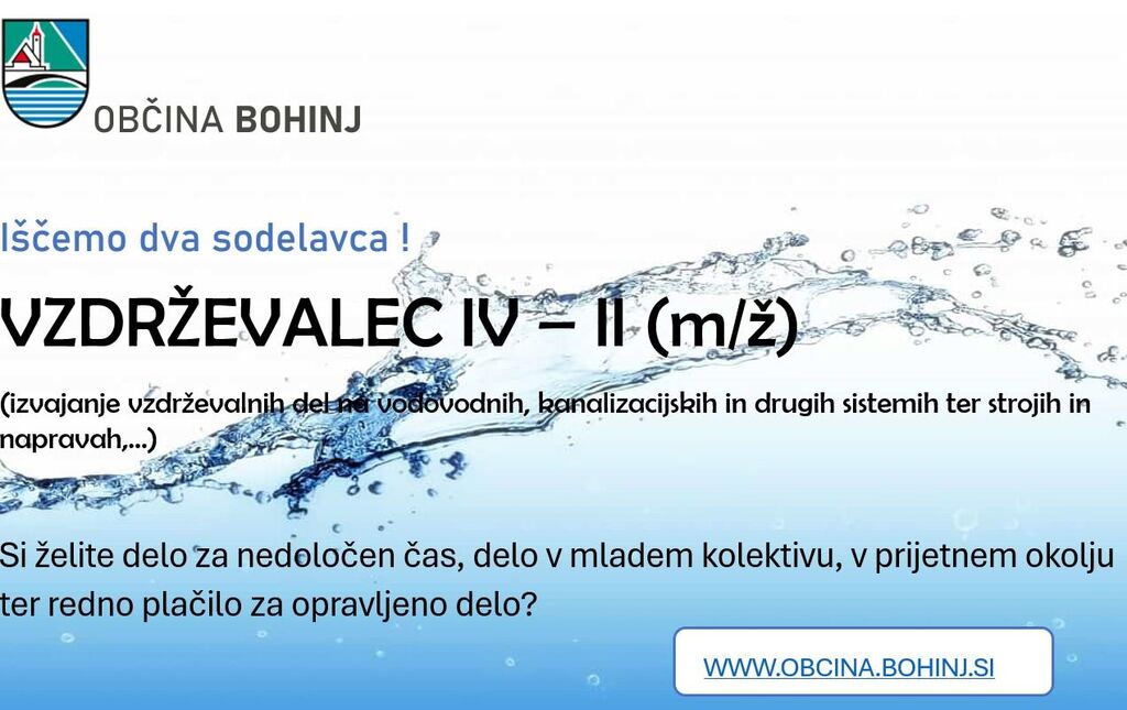 Na podlagi 56. člena Zakona o javnih uslužbencih (Uradni list RS, št. 63/07 – uradno prečiščeno besedilo, 65/08, 69/08 – ZTFI-A, 69/08 – ZZavar-E, 40/12 – ZUJF, 158/20 – ZIntPK-C, 203/20 – ZIUPOPDVE, 202/21 – odl. US in 3/22 – ZDeb)Občina Bohinj objavlja javni razpis za naslednji dve prosti delovni mesti: