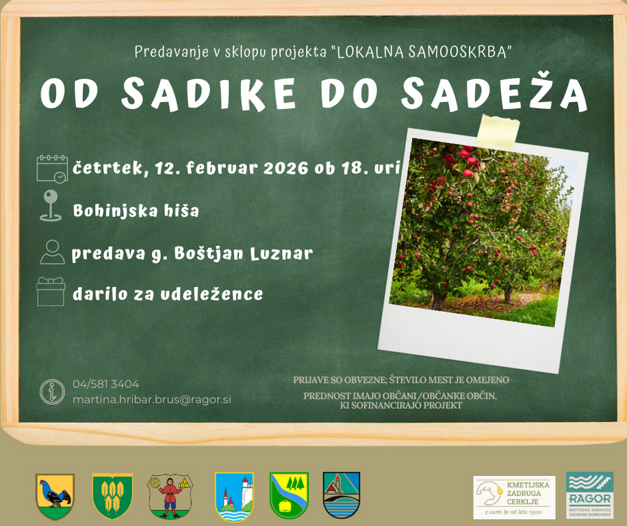V četrtek, 12. februarja 2026, ob 18. uri vas vabimo na predavanje »Od sadike do sadeža«, ki poteka v okviru projekta Lokalna samooskrba.
