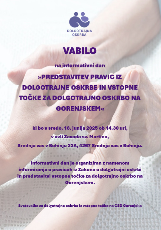 »PREDSTAVITEV PRAVIC IZ DOLGOTRAJNE OSKRBE IN VSTOPNE TOČKE ZA DOLGOTRAJNO OSKRBO NA GORENJSKEM«ki bo v sredo, 18. junija 2025 ob 14.30 uri,