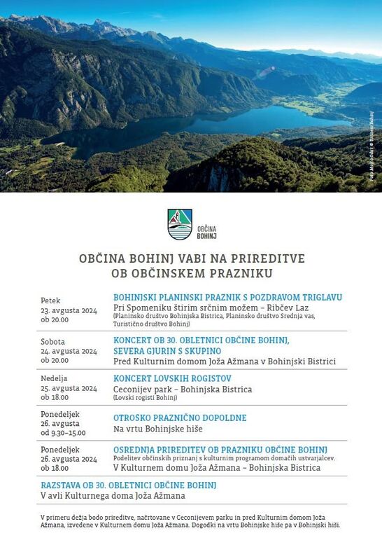 V čast Občinskemu prazniku bo v ponedeljek 26. avgusta ob 18. uri Osrednja slovesnost s podelitvijo Občinskih priznanj. Vabljeni na osrednjo slovesnost ob občinskem prazniku in tudi na ostale prireditve ob prazniku, ki se začne v petek s planinskim pozdravom Triglavu pri spomeniku štirim srčnim možem na Ribčevem lazu.