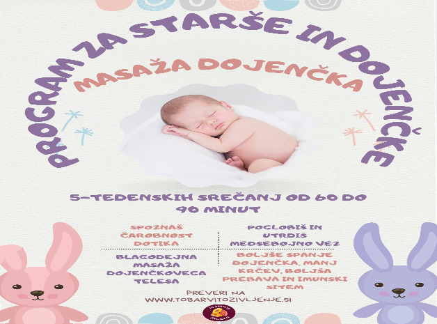 Tečaj je namenjen staršem z dojenčki od rojstva do 12 mesecev. Poteka v prijetnem, varnem okolju, kjer se boste naučili masažnih prijemov ter imeli možnost izmenjave izkušenj in vprašanj.