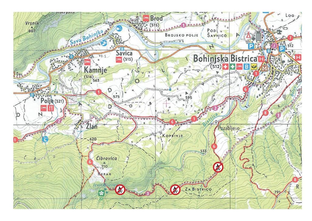 Pohodniška pot Bohinjska Bistrica (Pozabljeno, Rebro)–izvir Bistrice (pot št. 6) bo do nadaljnjega (predvidoma do spomladi 2020) zaprta zaradi sečnje lesa (napad podlubnikov). Zadrževanje na tem območju je lahko smrtno nevarno.